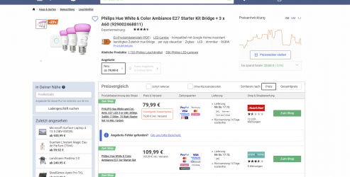 Bei Idealo erhaltet ihr momentan das Philips Hue White & Color Ambiance E27 Starter Kit Bridge + 3 x A60 für 79,99 € Inklusive versand statt 109,99€